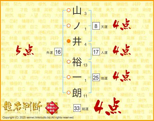 山(3画)ノ(1画)井(4画) 裕(13画)一(1画)朗(11画)