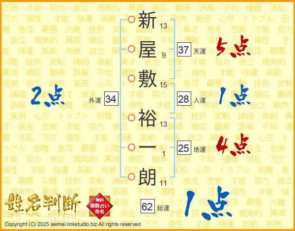 新(13画)屋(9画)敷(15画) 裕(13画)一(1画)朗(11画)