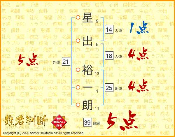 星(9画)出(5画) 裕(13画)一(1画)朗(11画)