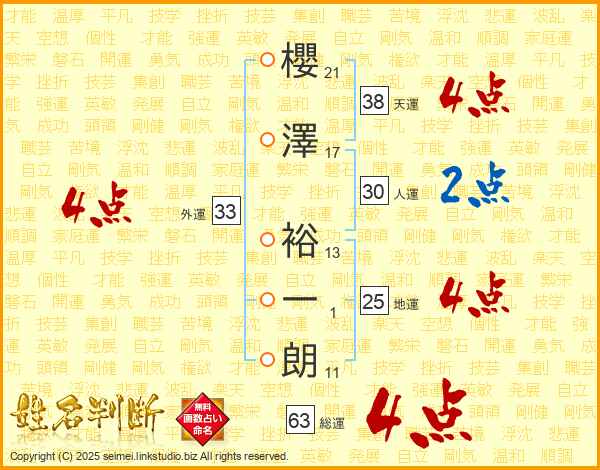 櫻(21画)澤(17画) 裕(13画)一(1画)朗(11画)