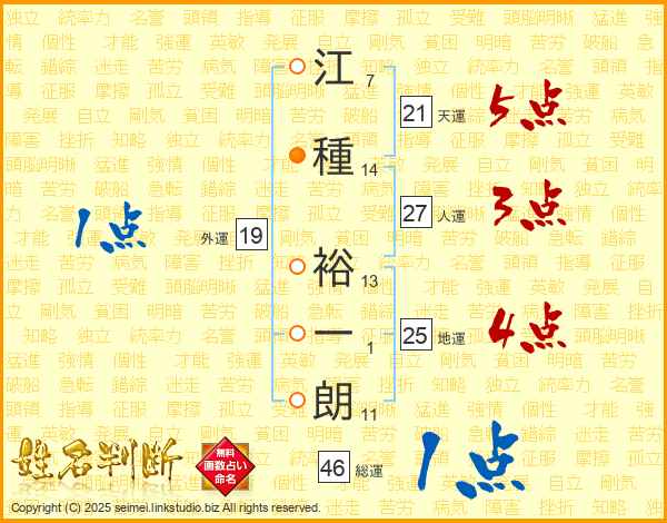 江(7画)種(14画) 裕(13画)一(1画)朗(11画)