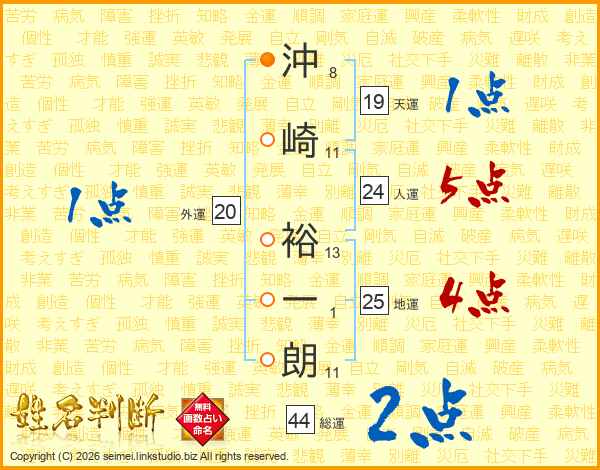 沖(8画)崎(11画) 裕(13画)一(1画)朗(11画)