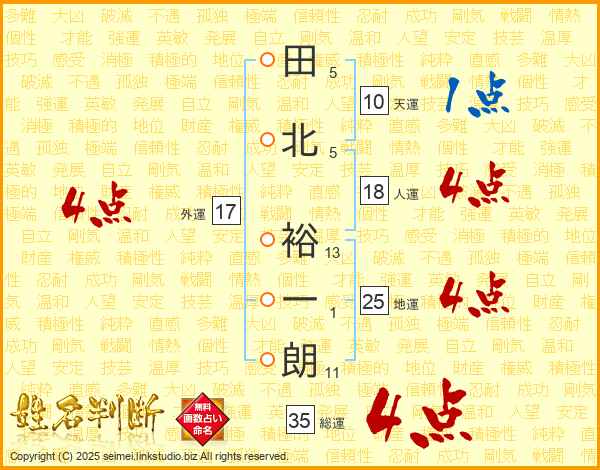 田(5画)北(5画) 裕(13画)一(1画)朗(11画)