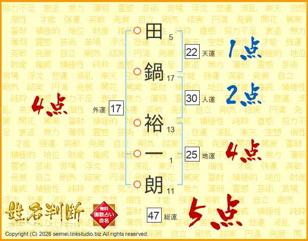 田(5画)鍋(17画) 裕(13画)一(1画)朗(11画)