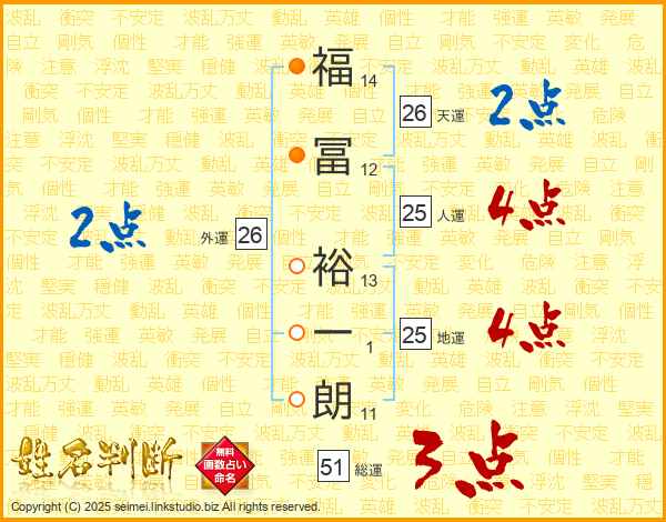 福(14画)冨(12画) 裕(13画)一(1画)朗(11画)