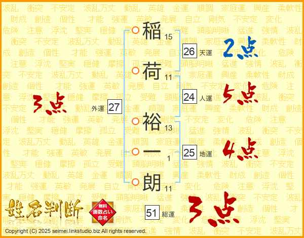 稲荷裕一朗さんの総運は51画の3点!