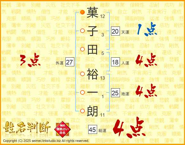 菓(12画)子(3画)田(5画) 裕(13画)一(1画)朗(11画)