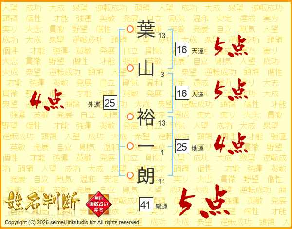 葉(13画)山(3画) 裕(13画)一(1画)朗(11画)