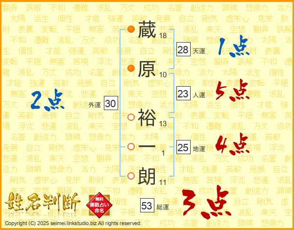 蔵(18画)原(10画) 裕(13画)一(1画)朗(11画)