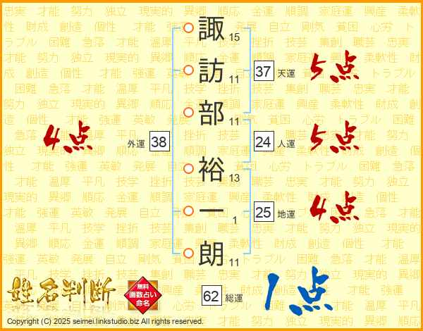 諏(15画)訪(11画)部(11画) 裕(13画)一(1画)朗(11画)