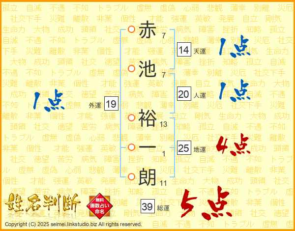 赤(7画)池(7画) 裕(13画)一(1画)朗(11画)