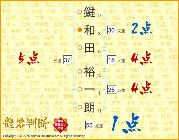 鍵(17画)和(8画)田(5画) 裕(13画)一(1画)朗(11画)