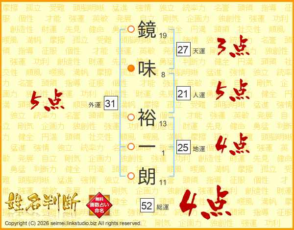 鏡味裕一朗さんの総運は52画の4点!