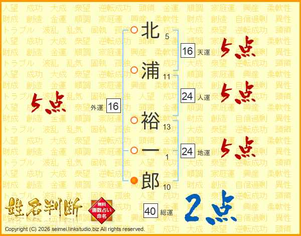 北(5画)浦(11画) 裕(13画)一(1画)郎(10画)
