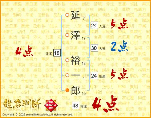 延(7画)澤(17画) 裕(13画)一(1画)郎(10画)