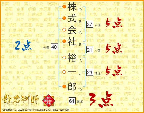 株(10画)式(6画)会(13画)社(8画) 裕(13画)一(1画)郎(10画)