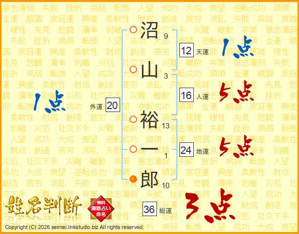 沼(9画)山(3画) 裕(13画)一(1画)郎(10画)