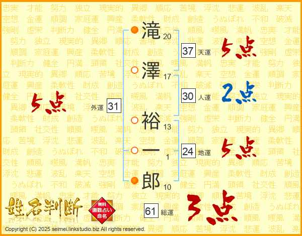 滝(20画)澤(17画) 裕(13画)一(1画)郎(10画)