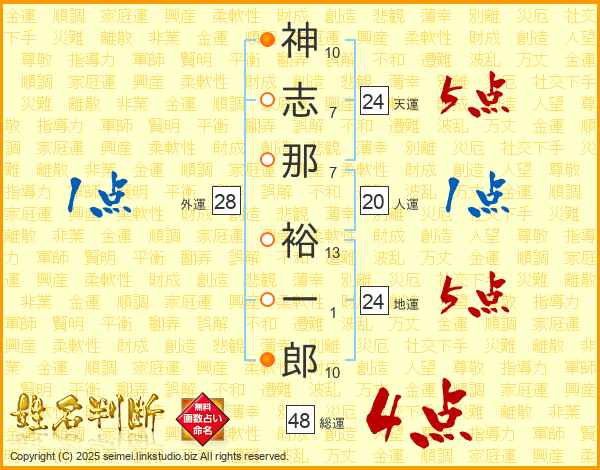 神(10画)志(7画)那(7画) 裕(13画)一(1画)郎(10画)