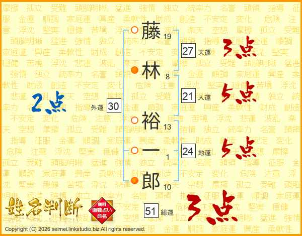 藤(19画)林(8画) 裕(13画)一(1画)郎(10画)