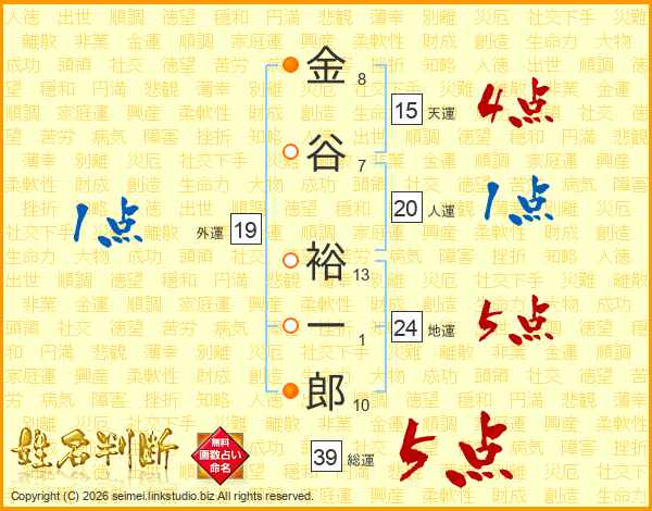 金(8画)谷(7画) 裕(13画)一(1画)郎(10画)