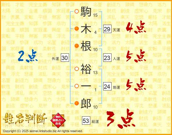 駒(15画)木(4画)根(10画) 裕(13画)一(1画)郎(10画)