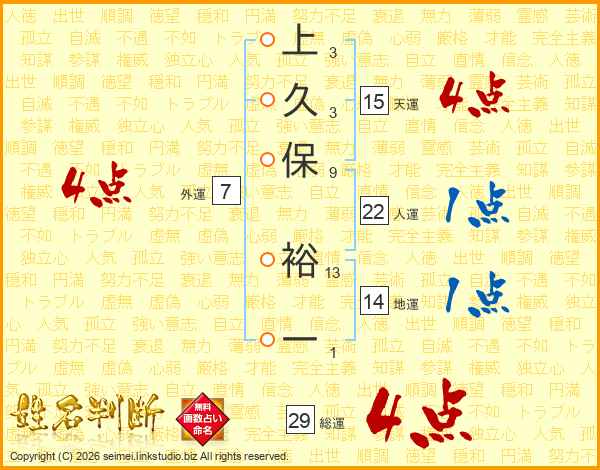 上(3画)久(3画)保(9画) 裕(13画)一(1画)