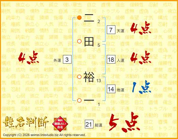 生活面を象徴する運勢です。外部から受ける影響力を表し、結婚運、家庭運や職場、環境への順応性を表します。総運から人運を引いた画数。姓や名が1文字の場合を除く。