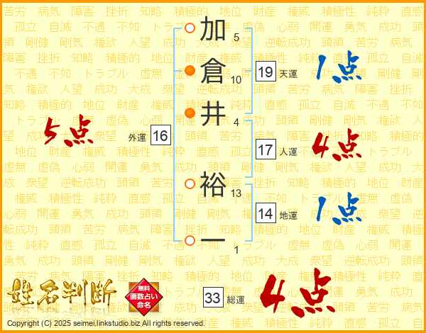 加(5画)倉(10画)井(4画) 裕(13画)一(1画)