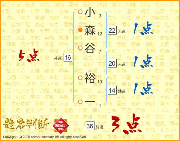 小(3画)森(12画)谷(7画) 裕(13画)一(1画)