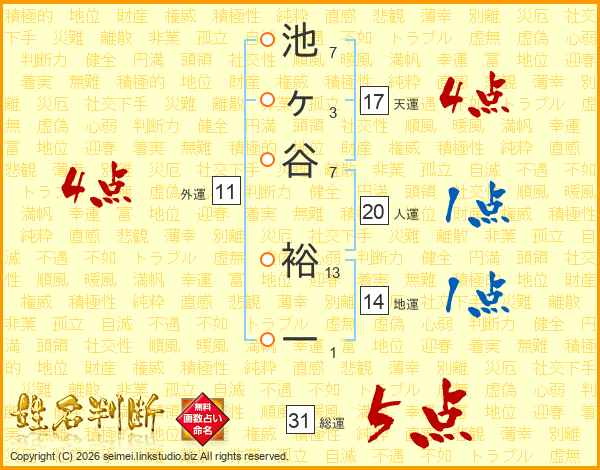 池(7画)ヶ(3画)谷(7画) 裕(13画)一(1画)