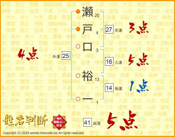 瀬(20画)戸(4画)口(3画) 裕(13画)一(1画)