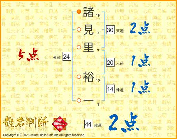 諸見里裕一さんの総運は44画の2点!