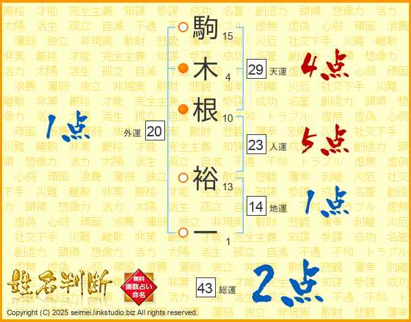 駒(15画)木(4画)根(10画) 裕(13画)一(1画)