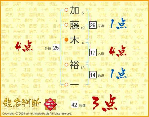 加(5画)藤(19画)木(4画) 裕(13画)一(1画)