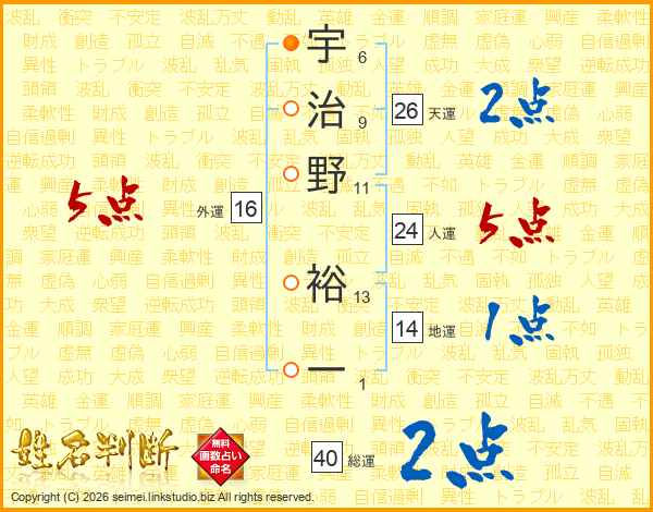 宇治野裕一さんの総運は40画の2点!