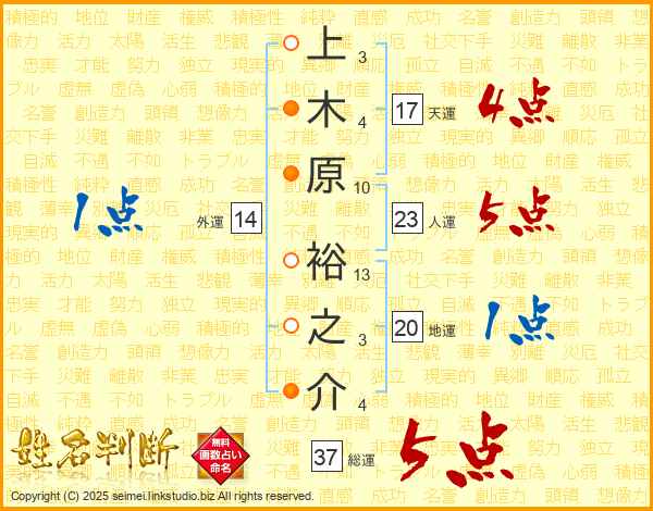 上(3画)木(4画)原(10画) 裕(13画)之(3画)介(4画)