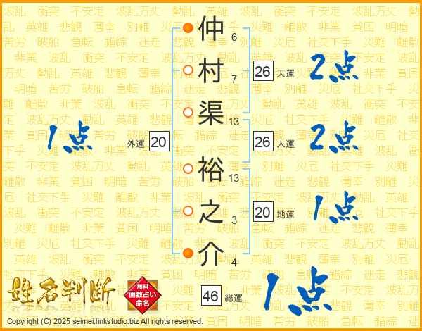 仲(6画)村(7画)渠(13画) 裕(13画)之(3画)介(4画)