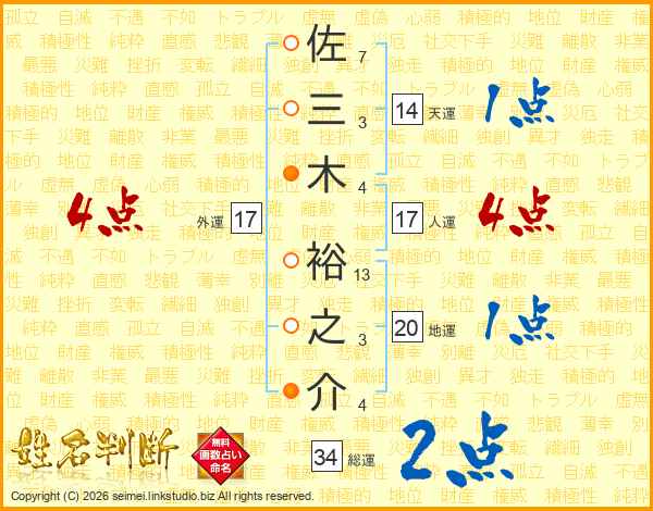 佐(7画)三(3画)木(4画) 裕(13画)之(3画)介(4画)