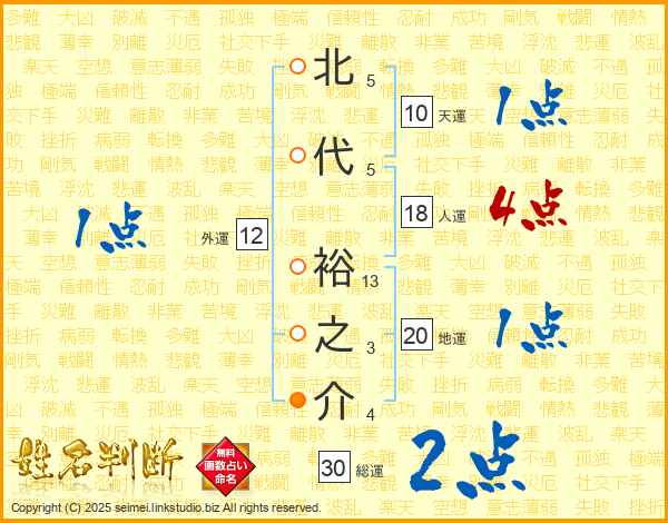 北(5画)代(5画) 裕(13画)之(3画)介(4画)