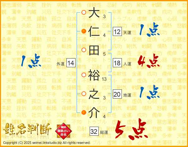 大(3画)仁(4画)田(5画) 裕(13画)之(3画)介(4画)