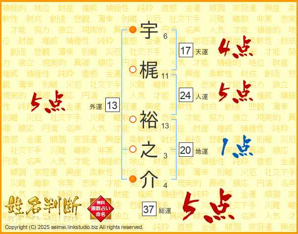 宇(6画)梶(11画) 裕(13画)之(3画)介(4画)