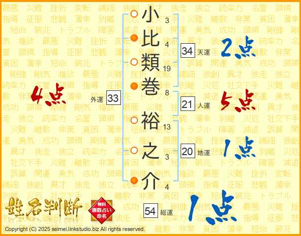 小(3画)比(4画)類(19画)巻(8画) 裕(13画)之(3画)介(4画)