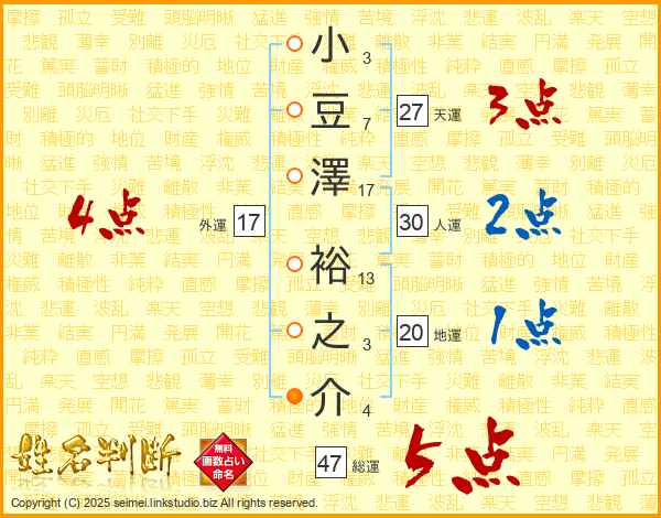 小豆澤裕之介さんの総運は47画の5点!