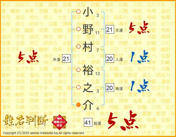 生活面を象徴する運勢です。外部から受ける影響力を表し、結婚運、家庭運や職場、環境への順応性を表します。総運から人運を引いた画数。姓や名が1文字の場合を除く。