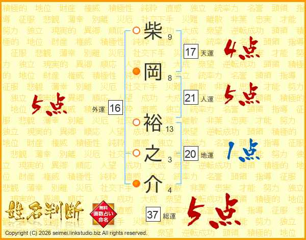 柴(9画)岡(8画) 裕(13画)之(3画)介(4画)