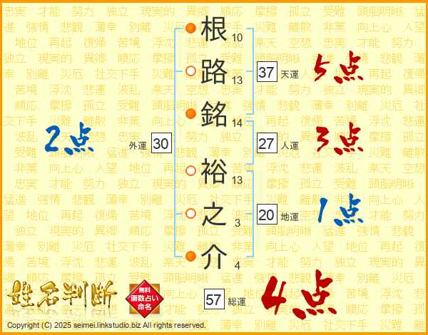 根(10画)路(13画)銘(14画) 裕(13画)之(3画)介(4画)