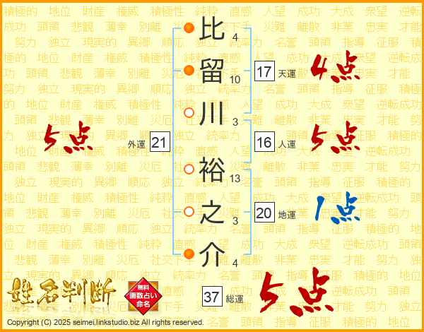 比(4画)留(10画)川(3画) 裕(13画)之(3画)介(4画)