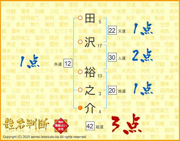 田(5画)沢(17画) 裕(13画)之(3画)介(4画)
