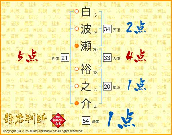 白(5画)波(9画)瀬(20画) 裕(13画)之(3画)介(4画)